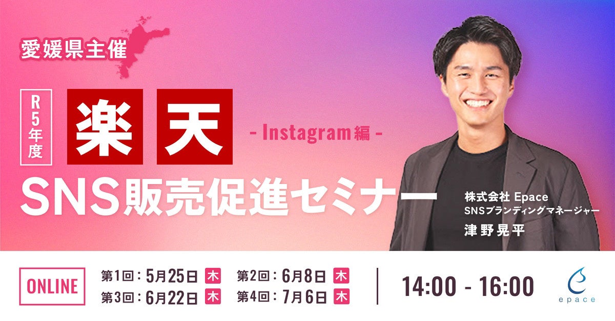 愛媛県と楽天の共催のセミナー「楽天SNS販売促進セミナー -Instagram編-」は、愛媛県内の事業者様を対象に「Instagramでの集客・販売促進」をお伝えするセミナーとなっております。そして今回、セミナーの講師を、イーペースのSNSブランディングマネージャーである、津野 晃平(つの こうへい)が務めました。