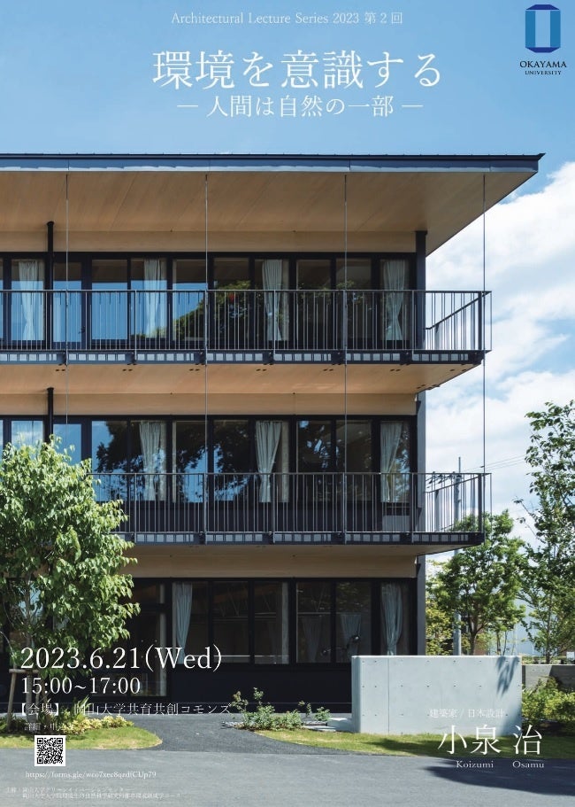 第2回は「環境を意識する-人間は自然の一部-」と題して、日本設計で建築家の小泉治氏をお招きして、2023年6月21日(水)15:00~17:00に岡山大学津島キャンパスの岡山大学共育共創コモンズ(OUX)で開催します。