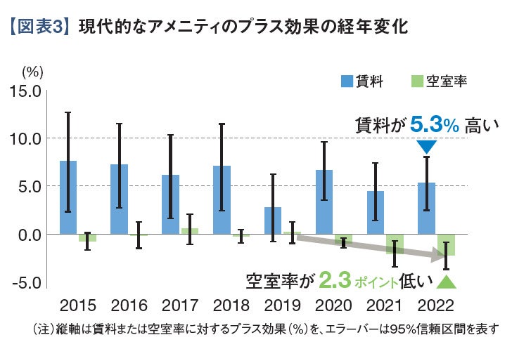 さらに、年ごとに同様の推定を行うと、賃料に対する影響は2019年を除く7時点で有意であり、市況に大きく左右されず、4.5~7.6%程度のプラス効果があることが分かりました【図表3】。なお、2019年については、空室率が極端に低く、賃料が高騰していた時期であったことから、現代的なアメニティの有無が賃料の差別化要因として機能していなかった可能性があります。