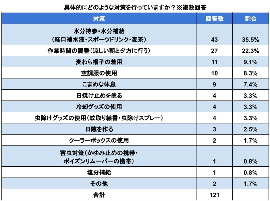「夏の農作業中、気をつけていることは何ですか?」(n=123)と質問したところ、「暑さ対策」と「水分補給」と回答した人が最も多く、合わせて全体の82.2%を占めました。これにより生産者様は夏の農作業中、特に熱中症対策を徹底されていることがわかりました。また、「具体的にどのような対策を行っていますか?」(n=123)という質問に対し、「経口補水液・スポーツドリンク・麦茶を飲む」と回答する人や「時間を調整し、気温が高くない朝や夕方に農作業を行う」と回答する人が全体の半数以上を占めました。水ではなく、汗で排出された成分を補うための飲み物を飲むという生産者様がほとんどで、そういった飲み物が熱中症対策に効果が高いとかなり認知されていると感じました。