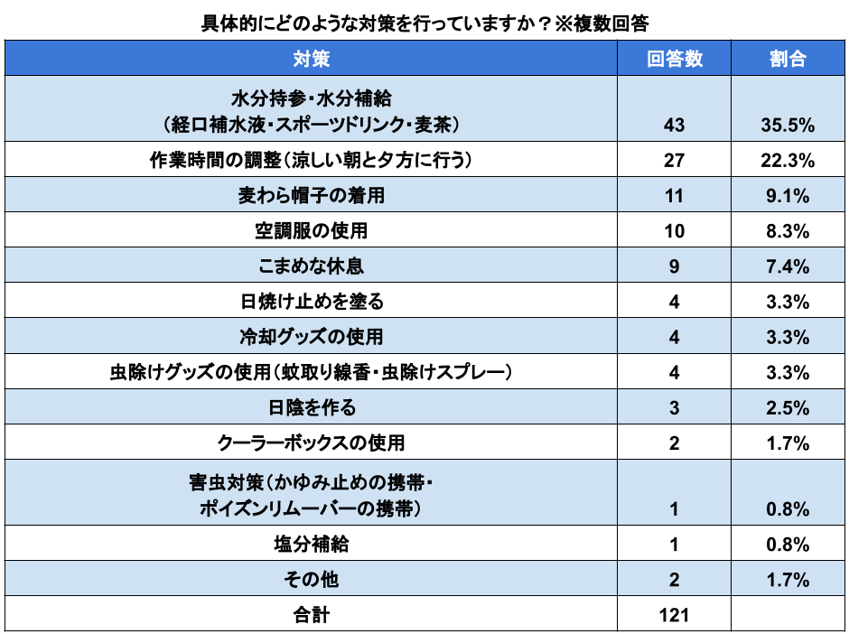 「夏の農作業中、気をつけていることは何ですか?」(n=123)と質問したところ、「暑さ対策」と「水分補給」と回答した人が最も多く、合わせて全体の82.2%を占めました。これにより生産者様は夏の農作業中、特に熱中症対策を徹底されていることがわかりました。また、「具体的にどのような対策を行っていますか?」(n=123)という質問に対し、「経口補水液・スポーツドリンク・麦茶を飲む」と回答する人や「時間を調整し、気温が高くない朝や夕方に農作業を行う」と回答する人が全体の半数以上を占めました。水ではなく、汗で排出された成分を補うための飲み物を飲むという生産者様がほとんどで、そういった飲み物が熱中症対策に効果が高いとかなり認知されていると感じました。