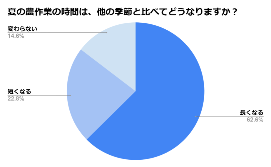 「夏の農作業の時間は、他の季節と比べてどうなりますか?」(n=123)と質問したところ、「他の季節と比べ、作業時間は長くなる」と感じる人が全体の62.6%を占めました。夏は気温が高く、過酷な環境であるにも関わらず、多くの生産者様が他の季節よりも長時間農作業を行っていることがわかりました。