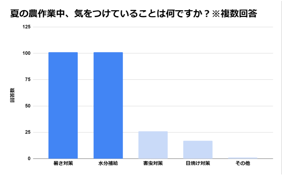 農作業は肉体労働であり、夏の高温下での作業は熱中症のリスクが高まります。生産者様の健康状態は作業効率に直結し、夏の農作業中に熱中症や脱水症状が発生すると、作業能力が低下し、生産者様の収入にも大きく影響すると推測します。生産者様の収入減少を防ぐためにも、生産者様の健康を守る必要があると考えます。具体的に、熱中症予防や適切な休憩時間の設定方法の指導、作業環境の改善の提案、機械導入の案内等が効果的ではないかと考えました。農機具王は生産者様の力になる取り組みの実施を検討してまいります。