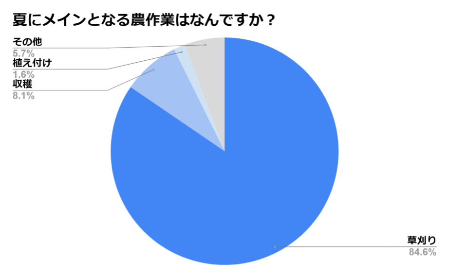 「夏にメインとなる農作業はなんですか?」(n=123)と質問したところ、「草刈り」と回答する人が最も多く、全体の84.6%を占めました。夏には雨量や気温の上昇によって、草や雑草の生育が活発化する傾向があります。草や雑草が生えると、作物に必要な栄養を吸収してしまい、作物の収量や品質に影響を与える可能性が高いため、夏場の草刈りは重要な役割を持ちます。手作業で草刈りを行うと時間や労力がかかるため、機械を導入するという生産者様も複数おられました。