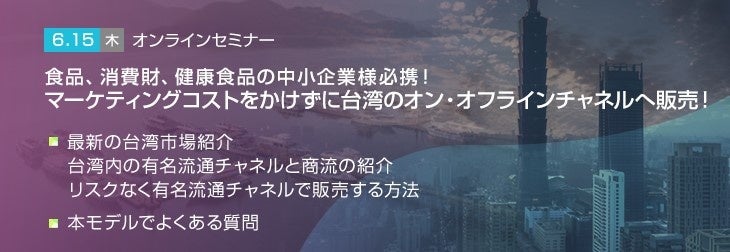 アジアでも随一の親日度の高さで、既に多くの日系企業が順調にビジネスを伸ばしている台湾。この魅力な市場の台湾の大手スーパー、コンビニ、テレビショッピングへ、リスクなく販売してみませんか?今後は上記チャネルのみならず、台湾の会社の社販、機内販売への販売拡大も可能です。台湾現地担当者より最新の市場動向含めて今回の取組スキームをご紹介します。