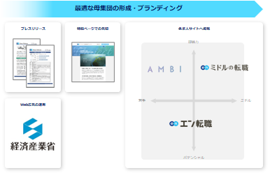 プレスリリースや特設ページ、Web広告での告知に加え、各求人サイトでの集客支援を行ないます。『エン転職』『AMBI』『ミドルの転職』とターゲットの異なる3つの求人サイトを活用することで、ターゲットへ網羅的に求人を届けます。