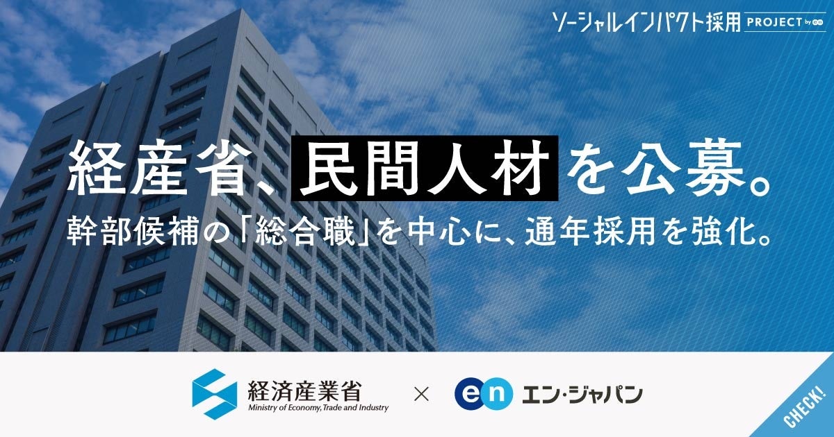経済産業省はこれまで、再生可能エネルギーへの投資、AIなどのテクノロジー活用推進、脱炭素化に向けた企業支援など、経済に関わる幅広い重要テーマに取り組んできました。さらに、昨今の世界情勢の変化、テクノロジーの発展、さまざまな社会課題にも取り組んでいくため、経済産業省に求められる役割はさらに大きくなっています。この状況に対応すべく、同省はエン・ジャパンを通して、さまざまな専門性やバックグラウンドを有する人材を民間から広く公募します。