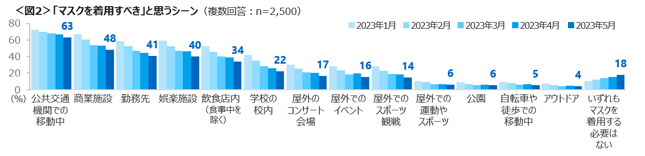 マスクを着用すべき外出先は、「公共交通機関での移動中」が63%、「商業施設」「勤務先」「娯楽施設」が4割台であり、いずれも減少傾向は続いている。<図2>