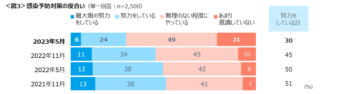 感染予防対策に対し、「努力をしている(最大限+努力している)」は30%、1年前までは「努力している」が半数を占めていたことから、感染予防意識の低下が見られる。また、感染予防対策は「あまり意識していない」が21%と半年前より11ptの増加。<図3>