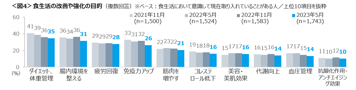 意識的に食生活を改善・強化している人の目的は、「ダイエット、体重管理」「腸内環境を整える」が3割台と多い。半年前の結果と比べると「腸内環境を整える」と「免疫力アップ」は5ptの減少。<図4>