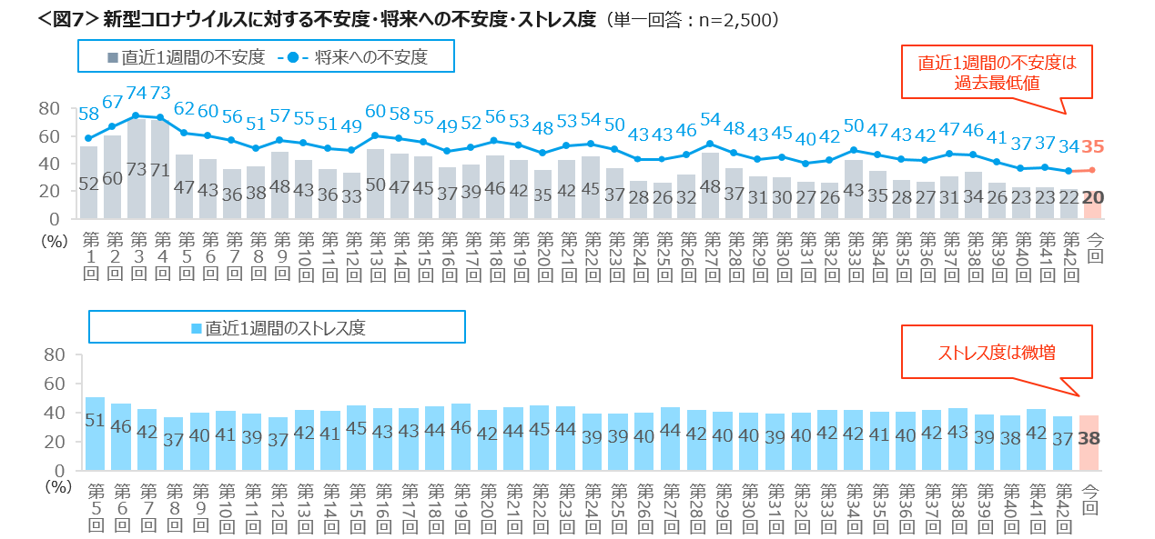 定点指標の「直近1週間の不安度」は、先月から微減の20%と過去最低値。「将来に対する不安度」は、先月から微増の35%。「直近1週間のストレス度」は、先月から微増の38%。<図7>