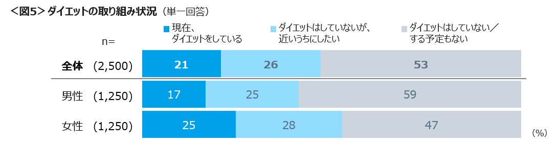 「現在、ダイエットをしている」は21%、「近いうちにダイエットをしたい」は26%であり、女性の「現在、ダイエットをしている」人は25%と多い。<図5>