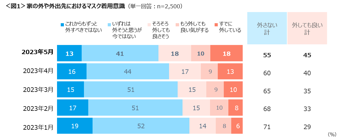 家の外や外出先でのマスクの着用意識について、「外しても良い(そろそろ外しても良さそう~すでに外している)」は45%であり、「すでに外している」人は18%と先月調査より5ptの増加。今年に入り”外しても良い”割合は、増加傾向が続いてはいるものの、マスクを外すことに抵抗感を持つ人は一定数いると考えられる。<図1>