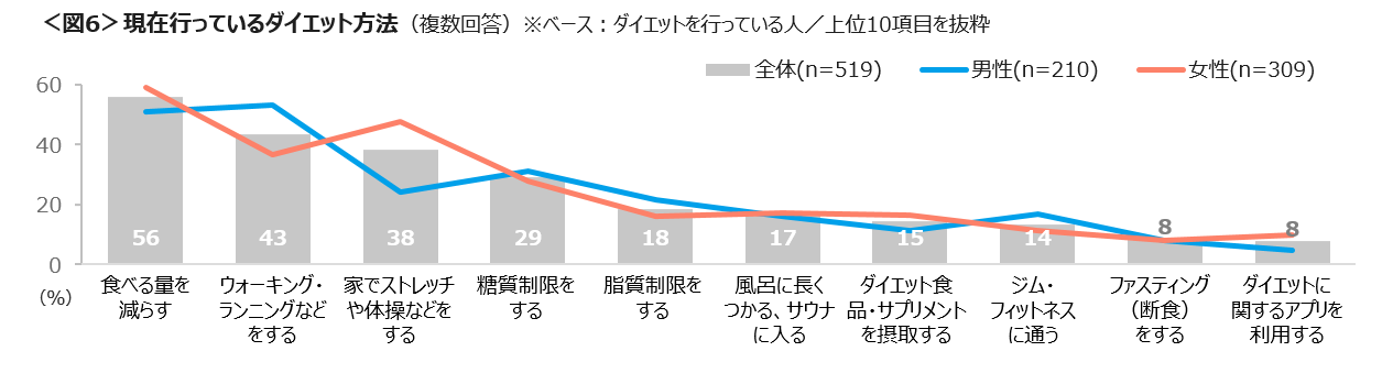 実際に行っているダイエットは「食べる量を減らす」が56%と最も多く、次いで「ウォーキング・ランニングなどをする」43%、「家でストレッチや体操などをする」38%が主な方法である。男性は「ウォーキング・ランニング」、女性は「ストレッチ」をする割合が多い。<図6>