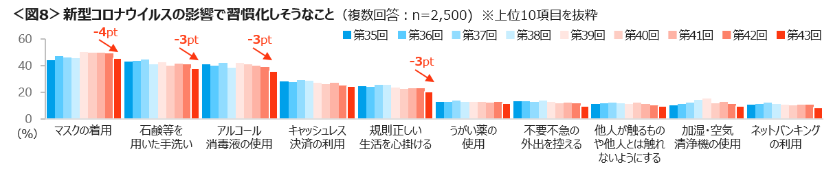 コロナにより習慣化しそうなことでは、「マスクの着用」「石鹸などを用いた手洗い」「アルコール消毒の使用」の予防対策、「規則正しい生活を心掛ける」の低下が目立つ。<図8>