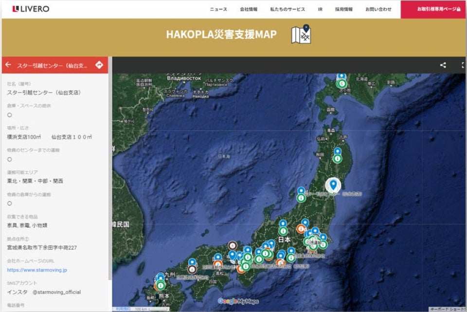 被災地(被災者)の方やボランティア団体から、わかりやすくするために、Googleマップで、全国の引越会社を表示した災害支援マップが完成いたしました。