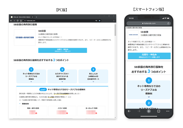 保険選びサイト「保険市場」に掲載を開始したSBI損保の『SBI損保の海外旅行保険』は、インターネットでお申し込みいただける保険商品です。「保険市場」PCサイトおよびスマートフォンサイトにて、商品の詳細をご確認いただけます。