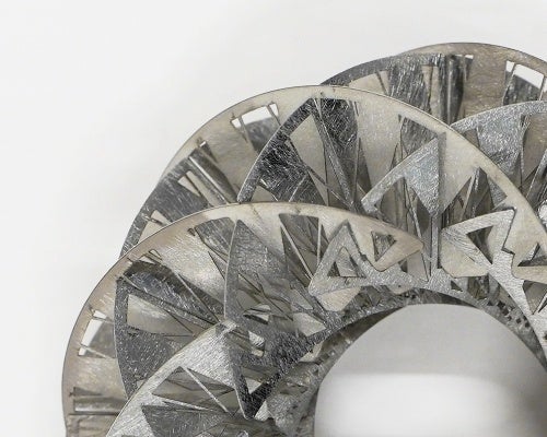 円の外側に回転軸を置き得られる回転体で「ドーナツ型」が特徴。ステンレス板を一枚ずつ組み合わせて立体にしているため、幾何学的なデザインの大小様々な穴から綺麗な光が抜ける設計になっています。