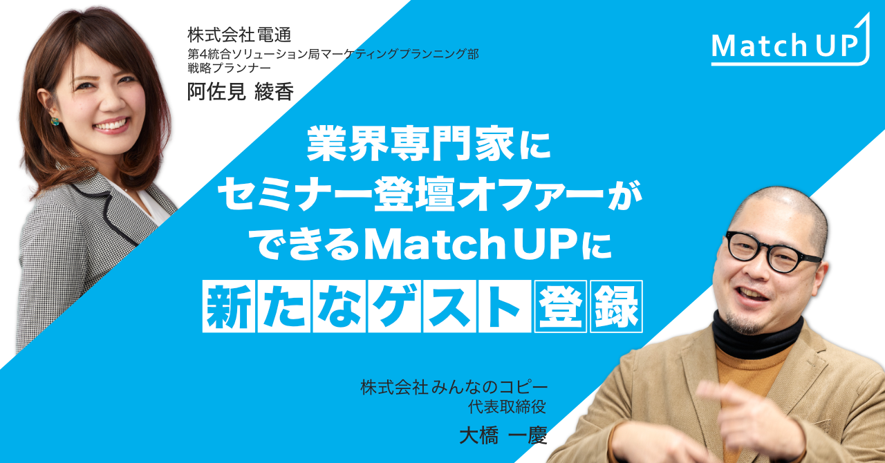 当社は、国内最大級のオンライン展示会「ITトレンド」や、ビジネス動画プラットフォーム「チラヨミ」を通して、多くの企業様、業界専門家の方とのお取引があり、自社のマーケティングノウハウを活かし、このような課題を解消するため、業界専門家にセミナー登壇オファーができるマッチングプラットフォーム「Match UP」の提供を開始いたしました。