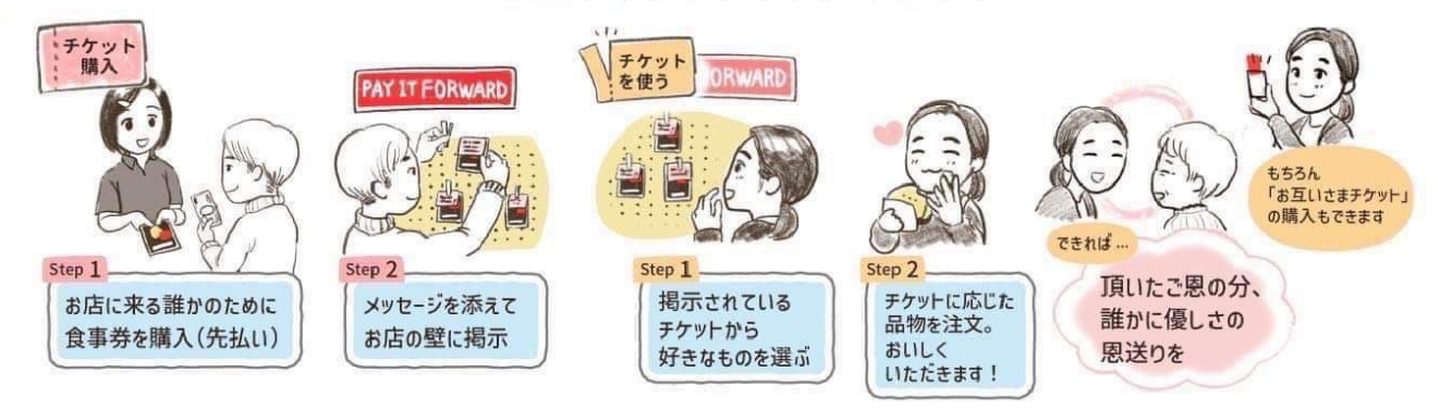 この仕組みを導入している店舗で見知らぬ誰かの為にチケットを購入することで、チケットを利用する方が無料で食事できる仕組み。福島県内が「困ったときはお互いさま」の気持ちで溢れてほしい、という想いから始まった取り組みで、県内100店舗の導入を目指している。