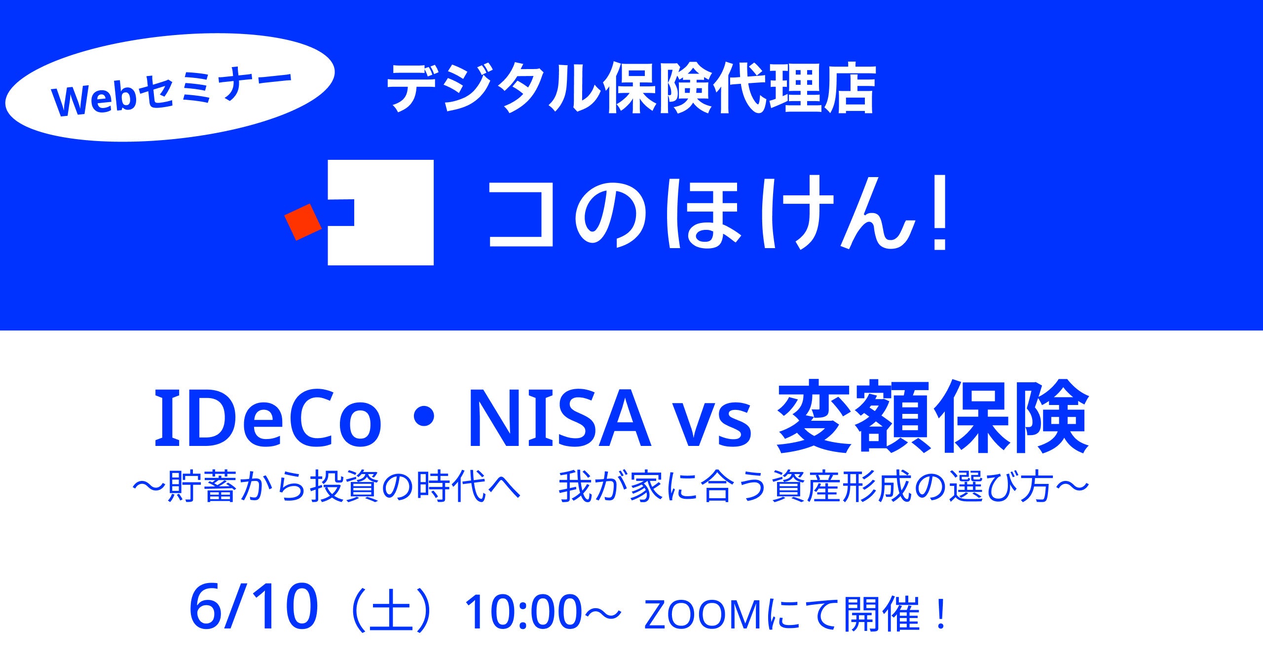 コのほけん!では6/10に無料オンラインセミナー「IDeCo・NISA vs 変額保険 ~貯蓄から投資の時代へ 我が家に合う資産形成の選び方~」を開催します。