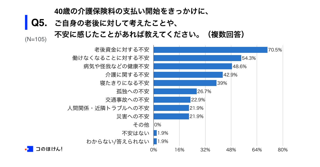 Q5.40歳の介護保険料の支払い開始をきっかけに、ご自身の老後に対して考えたことや、不安に感じたことがあれば教えてください。(複数回答)N=105