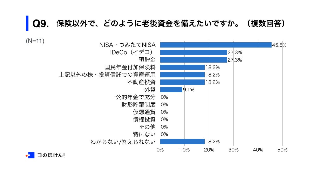 Q9.保険以外で、どのように老後資金を備えたいですか。(複数回答)N=11(Q7で「あまりそう思わない」「全くそう思わない」と回答した方のみ)
