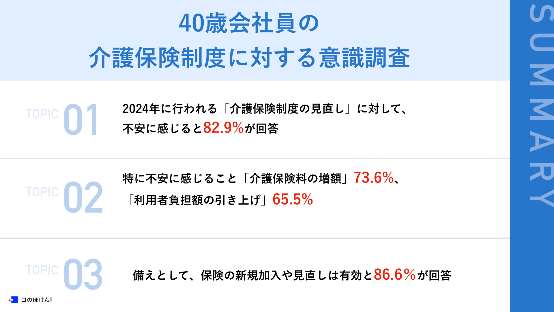 調査結果より、 2024年の介護保険制度の見直しに対して、約8割の40歳会社員が不安に感じていることがわかりました。特に不安に感じることとして、「介護保険料の増額」や「利用者負担額の引き上げ」などの声が挙がりました。また、40歳からの介護保険料の支払い開始をきっかけに、「老後資金に対する不安」を感じていることもわかりました。そのため、「適切な保険に入っておくことで将来の安心につながると思う」といった理由から、約9割近くが、将来の老後資金に対する備えとして、保険の新規加入や見直しは有効だと回答しました。