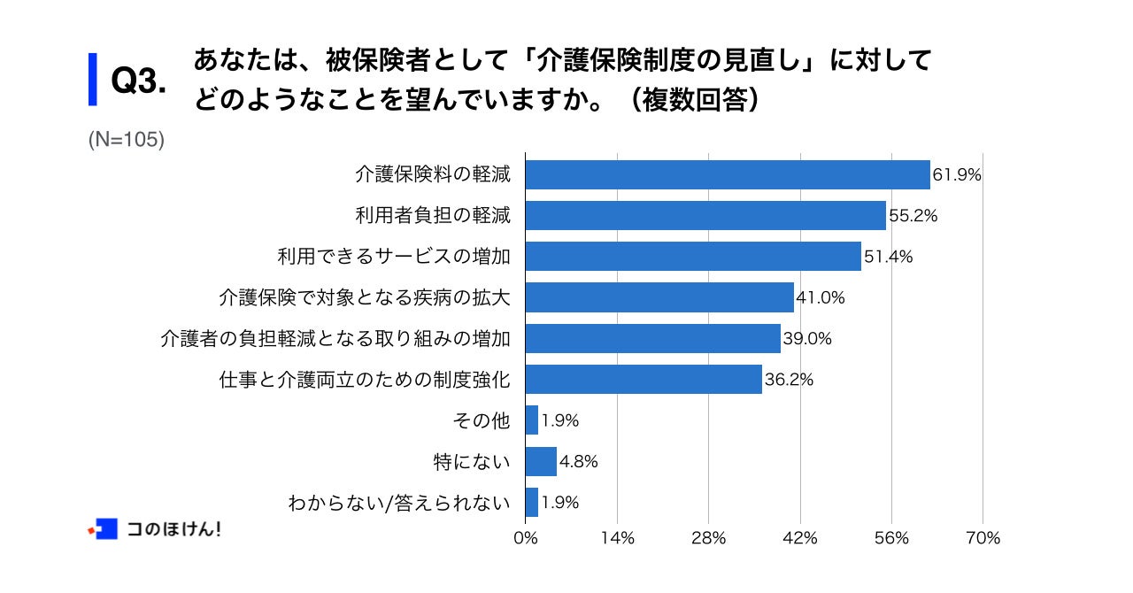 Q3.あなたは、被保険者として「介護保険制度の見直し」に対してどのようなことを望んでいますか。(複数回答)N=105