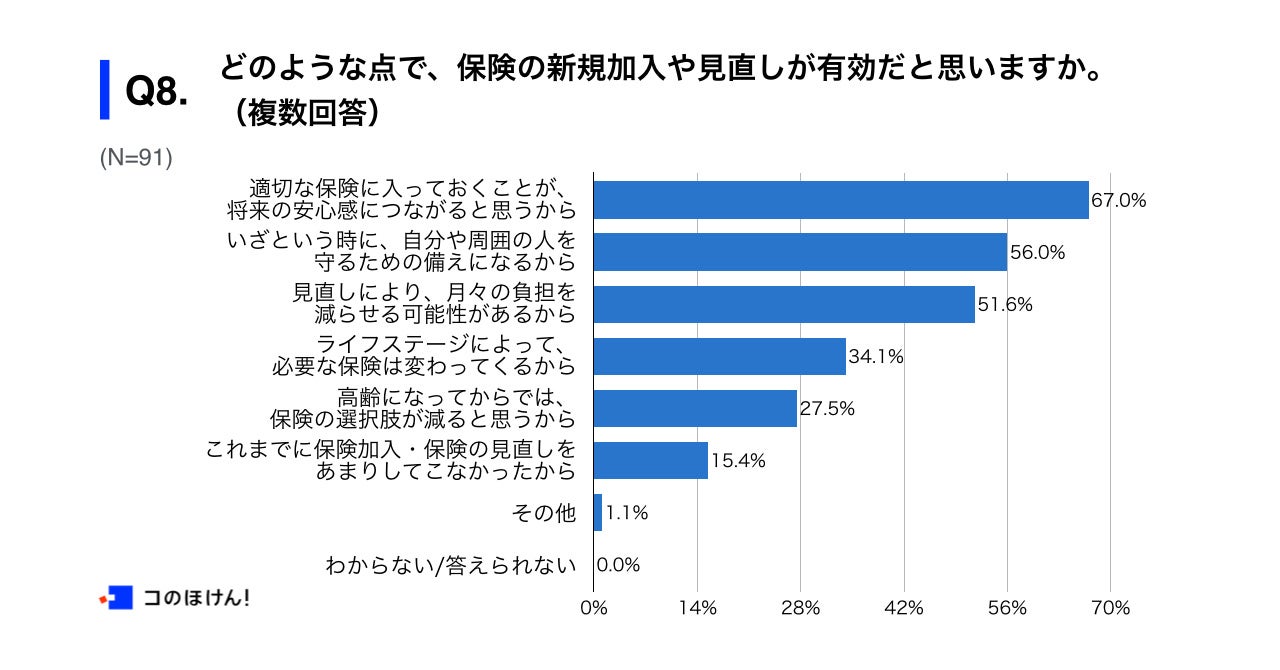 Q8.どのような点で、保険の新規加入や見直しが有効だと思いますか。(複数回答)N=91(Q7で「非常にそう思う」「ややそう思う」と回答した方のみ)