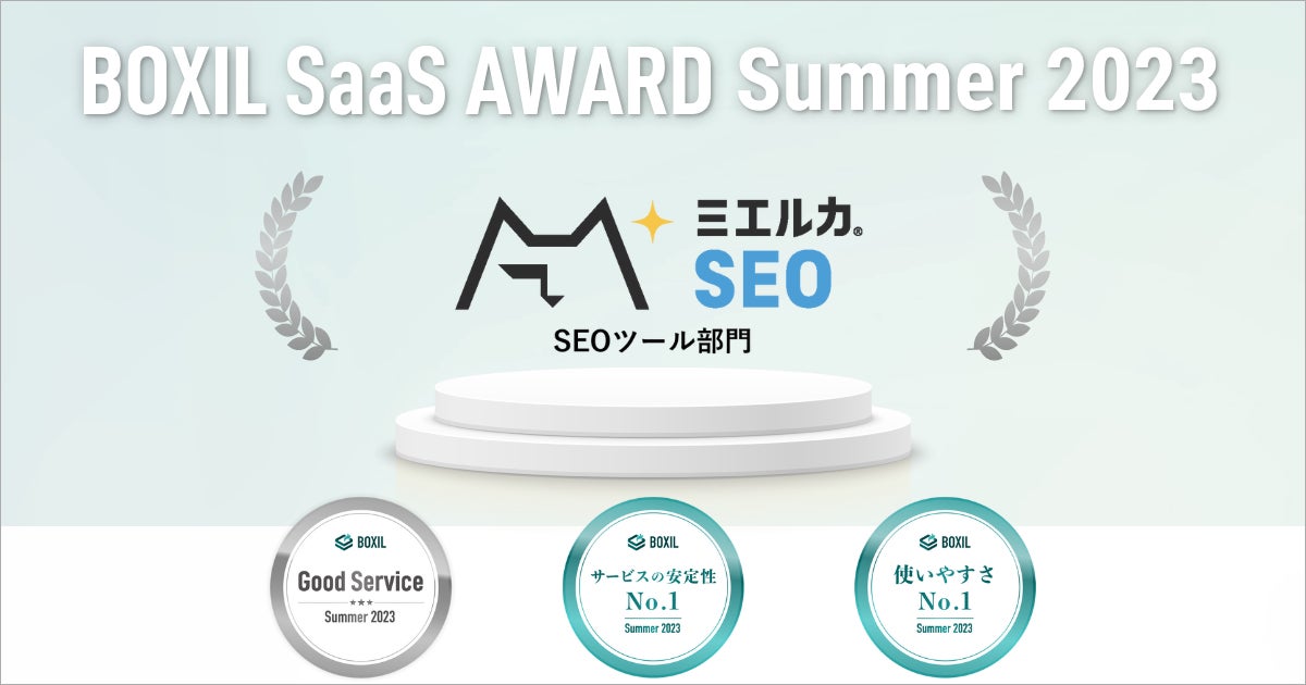 今回ミエルカSEOが受賞したSEOツール部門の「Good Service」は 「BOXIL SaaS」上に投稿された口コミを対象に、各カテゴリで総得点の高いサービスに対して、「サービスの安定性No.1」「使いやすさNo.1」は、「BOXIL SaaS」上に投稿された「口コミによるサービス評価」9項目を対象に、各カテゴリ、各項目において一定の基準を満たした上で、最も高い平均点を獲得したサービスに対して付与されるものです。