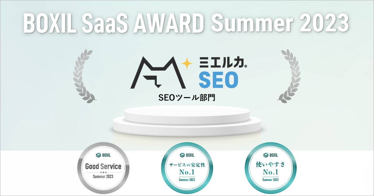 今回ミエルカSEOが受賞したSEOツール部門の「Good Service」は 「BOXIL SaaS」上に投稿された口コミを対象に、各カテゴリで総得点の高いサービスに対して、「サービスの安定性No.1」「使いやすさNo.1」は、「BOXIL SaaS」上に投稿された「口コミによるサービス評価」9項目を対象に、各カテゴリ、各項目において一定の基準を満たした上で、最も高い平均点を獲得したサービスに対して付与されるものです。