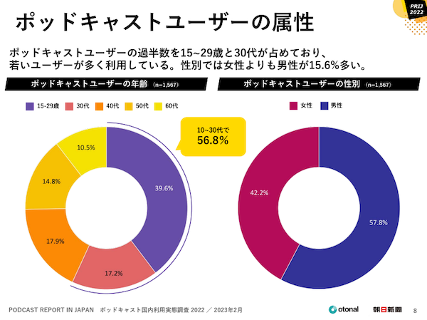 オトナル・朝日新聞社調べの「ポッドキャスト国内利用実態調査2022」※1 によると、ポッドキャストユーザーの属性は10~30代で56.8%を占めており、営業職の主力として活躍し、学びを得ることに前向きな年代のユーザーが多くいます。