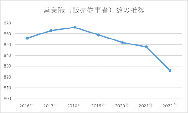 総務省統計局によって毎年実施される労働力調査年報によると、営業職(販売従事者)人口は減少傾向にあります。2001年には968万人の営業職がいたのに対し、2022年には826万人まで減少しました。