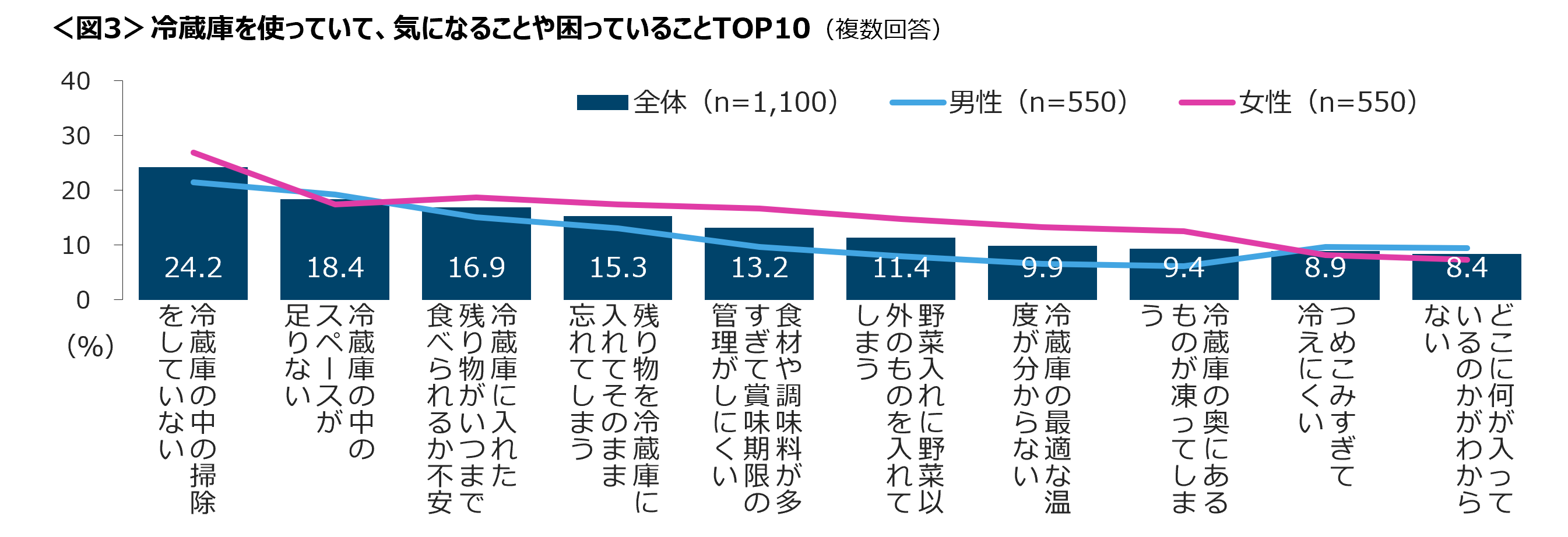 冷蔵庫の気になることは、「冷蔵庫の中の掃除をしていない」が24.2%と高い。<図3>