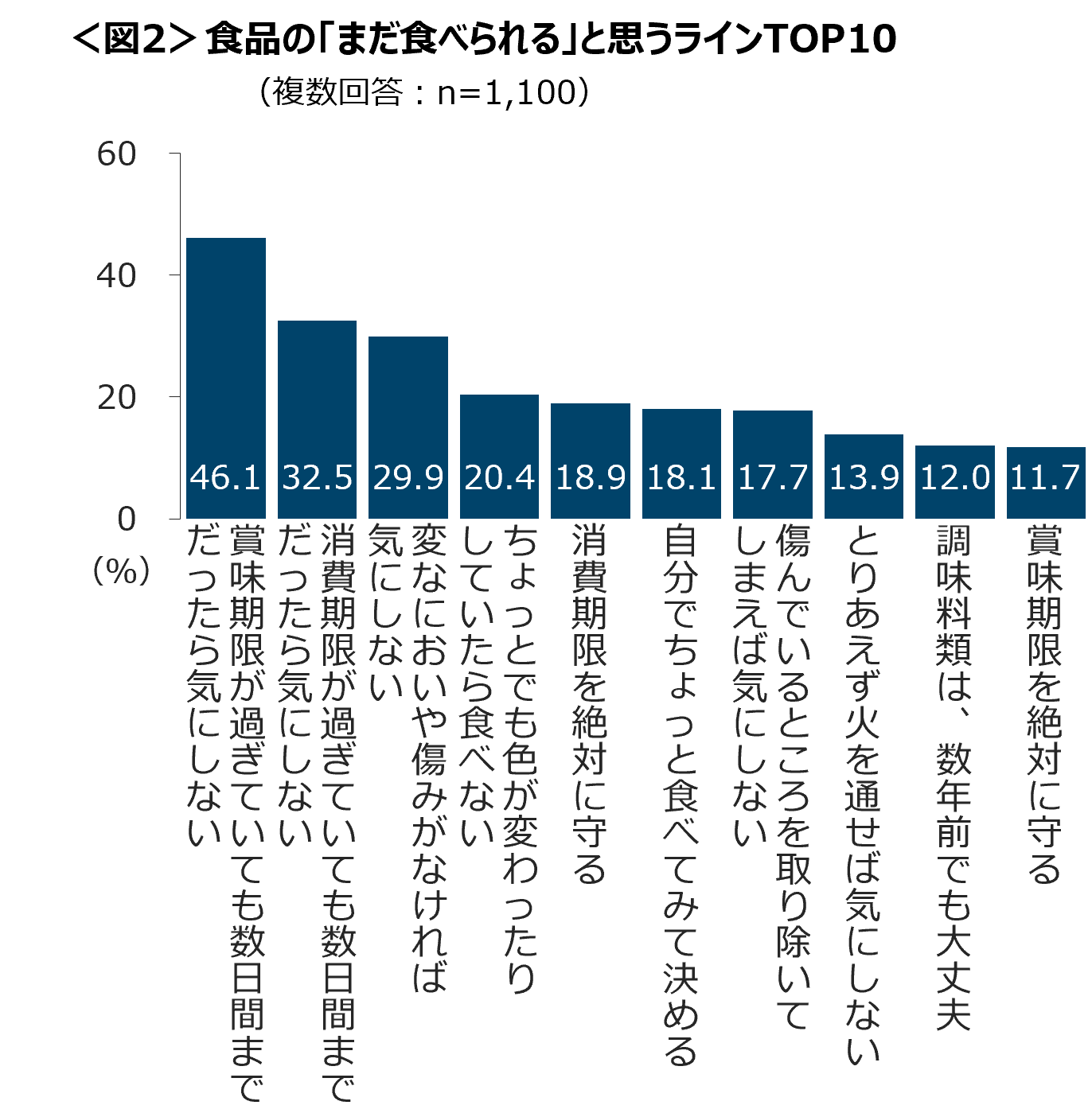 「まだ食べられる」と思う食品のラインは、「賞味期限が数日過ぎても気にしない」が46.1%で最も多く、「消費期限が数日過ぎていても気にしない」「変なにおいや傷みがなければ気にしない」が3割前後で続く。<図2>