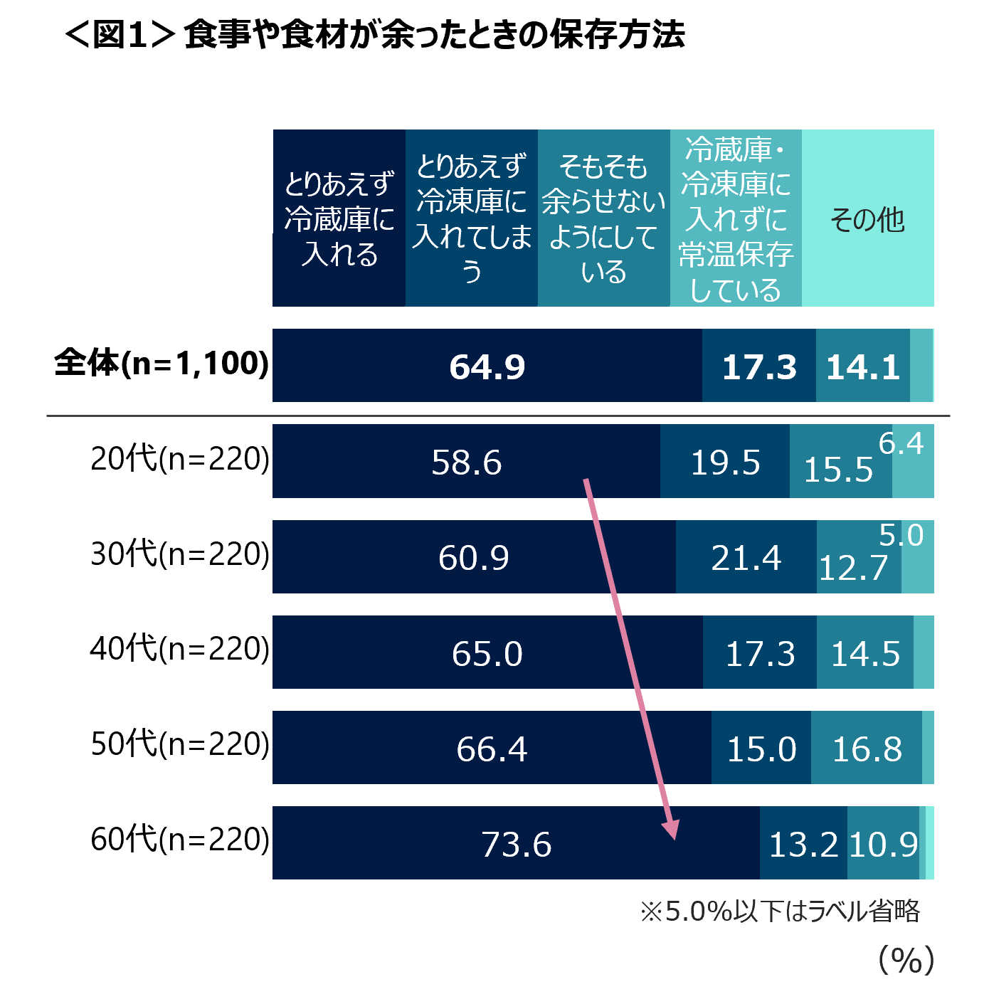 年代が上がるにつれて「とりあえず冷蔵庫に入れる」人が多くなり、60代は73.6%を占める。