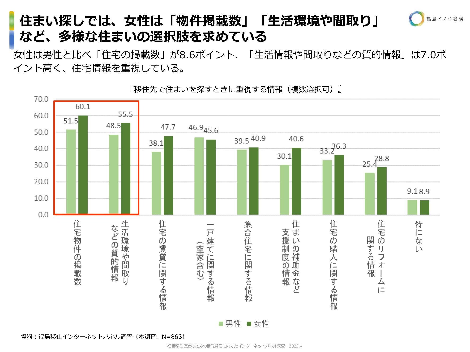 「移住先で住まいを探す時に重視する情報」について聞いたところ、女性は男性と比べ「住宅の掲載数」が8.6ポイント、「生活環境や間取りなどの質的情報」は7.0ポイント高く、住宅情報を重視していることが分かりました。