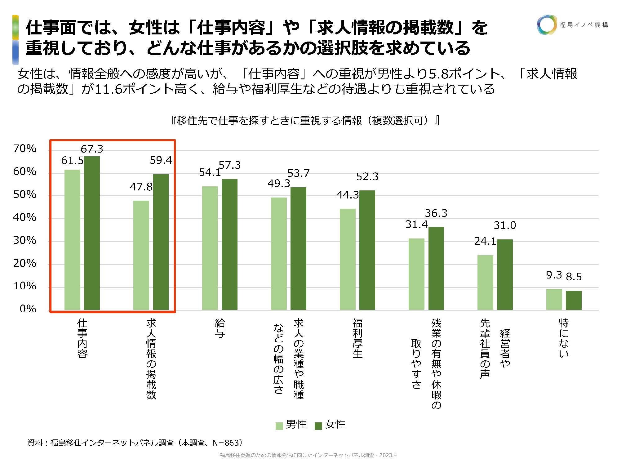 ■ 仕事面では、女性は「仕事内容」や「求人情報の掲載数」を重視しており、どんな仕事があるかの選択肢を求めている