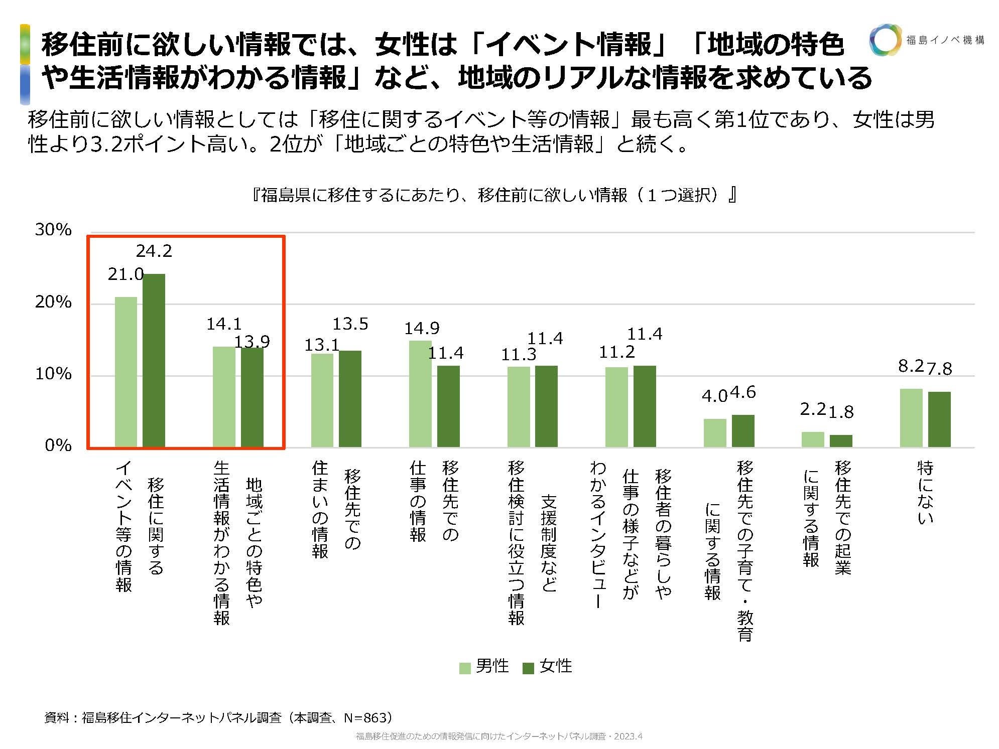 「移住前に欲しい情報」について聞いたところ、「移住に関するイベント等の情報」が最も高く第1位であり、女性は男性より3.2ポイント高く、2位が「地域ごとの特色や生活情報がわかる情報」と続くことが分かりました。
