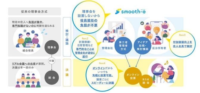 理事会を設置しないため役員就任の負担が軽減。決議もオンラインで、リアル会議もなく気楽に投票できる新しいマンション管理の形、「smooth-e」(長谷工コミュニティ)を導入。計画修繕・日常管理などは、専門の管理会社が実行します。アイデア投稿・検討機能が備わり、住人は思いついたアイデアをいつでも投稿できます。