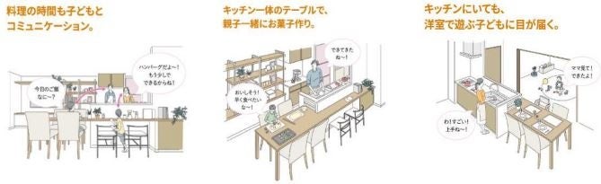 「並んで洗える片寄洗面ボウル」「コンセントの位置を 40 ㎝に(一般 25 ㎝)」「プッシュプルハンドル」「フランジレスの排水口」「洗面カウンター下収納」「リビング収納」
