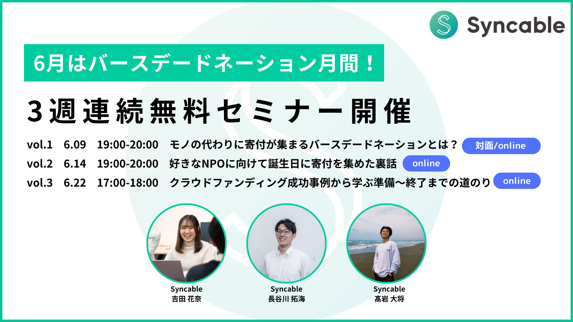 「バースデードネーション月間」の3週連続セミナーは1回のみでも参加可能です。