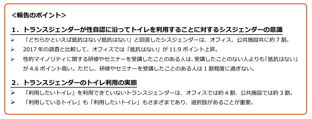 「トイレのオールジェンダー利用に関する研究会」による意識調査 結果報告 トランスジェンダーの性自認に沿ったトイレ利用、シスジェンダーの意識に変化