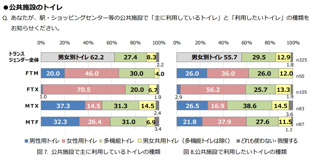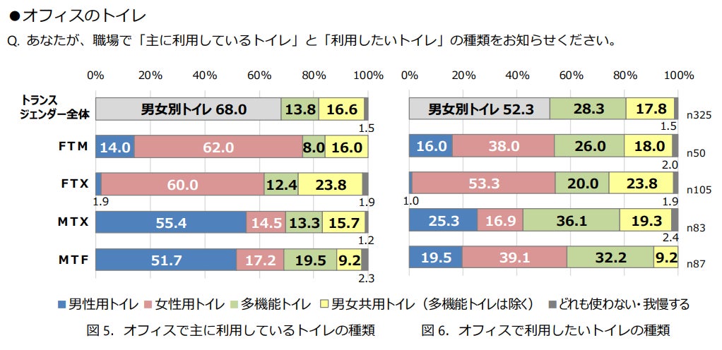 オフィス、公共施設共に、トランスジェンダーが「利用しているトイレ」も「利用したいトイレ」もさまざまです。「利用したいトイレ」では、両施設共に5割強が男女別トイレ、4割強が性別を問わず利用できる「多機能トイレ(※)」や「男女共用トイレ」と回答しました。