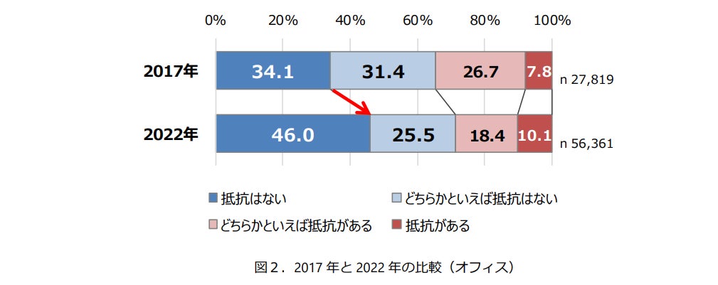 オフィスについては、“どちらかといえば”も含めて「抵抗はない」と回答した人の割合は、2017年の65.5%から2022年では6ポイント増加し、71.5%でした。特に、「抵抗はない」が11.9ポイント増加し、この5年で性自認に沿ったトイレ利用に対する意識の変化がみられます。