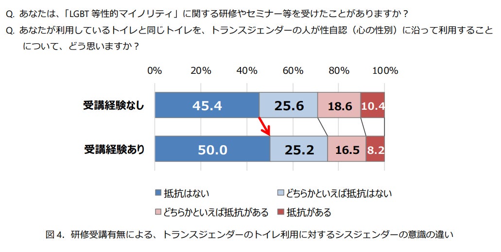 研修等の受講経験がある人は、ない人に比べて、トランスジェンダーが性自認に沿ってトイレを利用することに対して「抵抗はない」と回答した人の割合が4.6ポイント高い結果となりました。