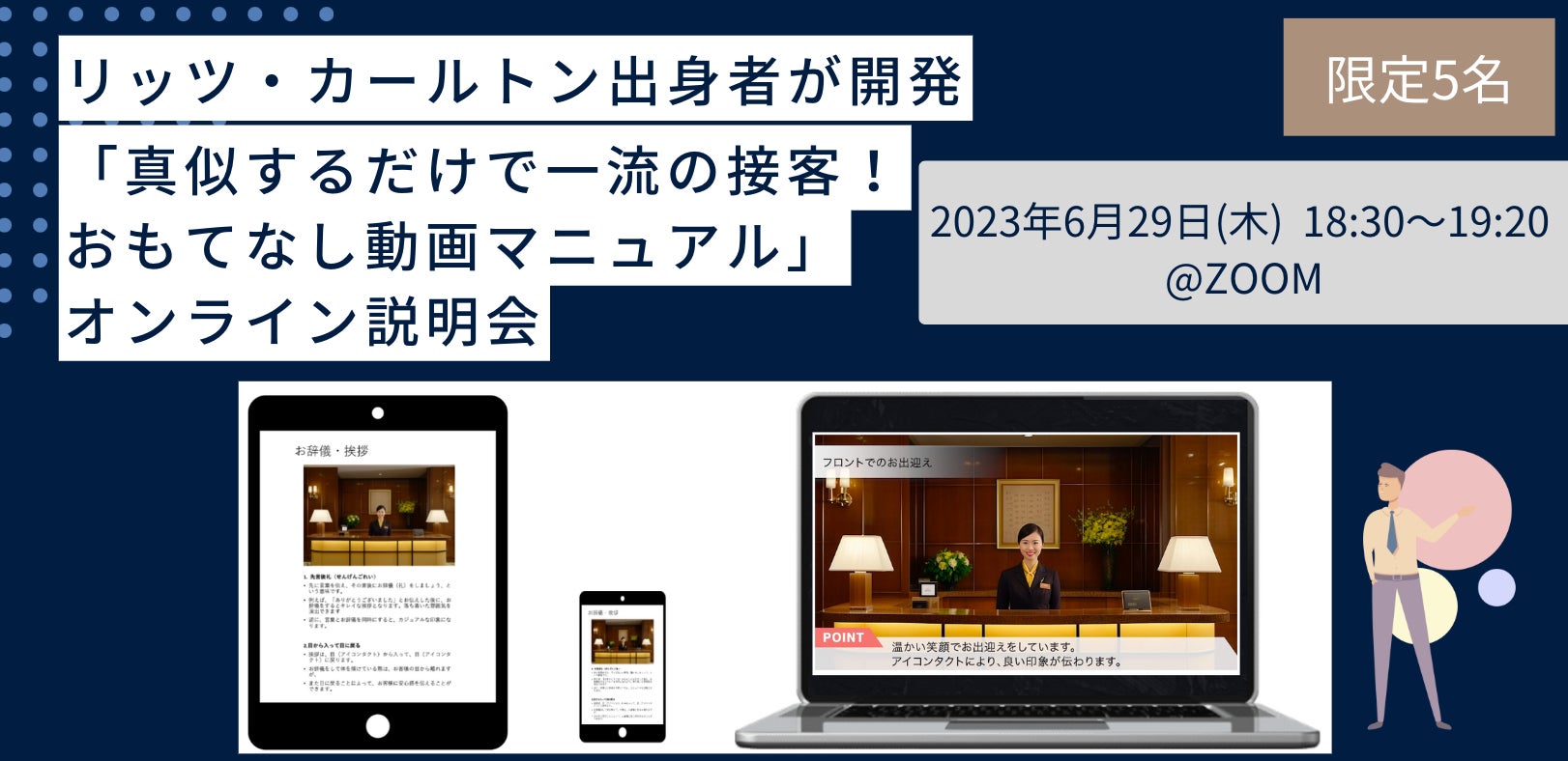 リッツ・カールトン出身者が開発した、「真似するだけで一流の接客!おもてなし動画マニュアル」のオンライン説明会を開催 2023年6月29日(木)18:30〜19:20(50分間)