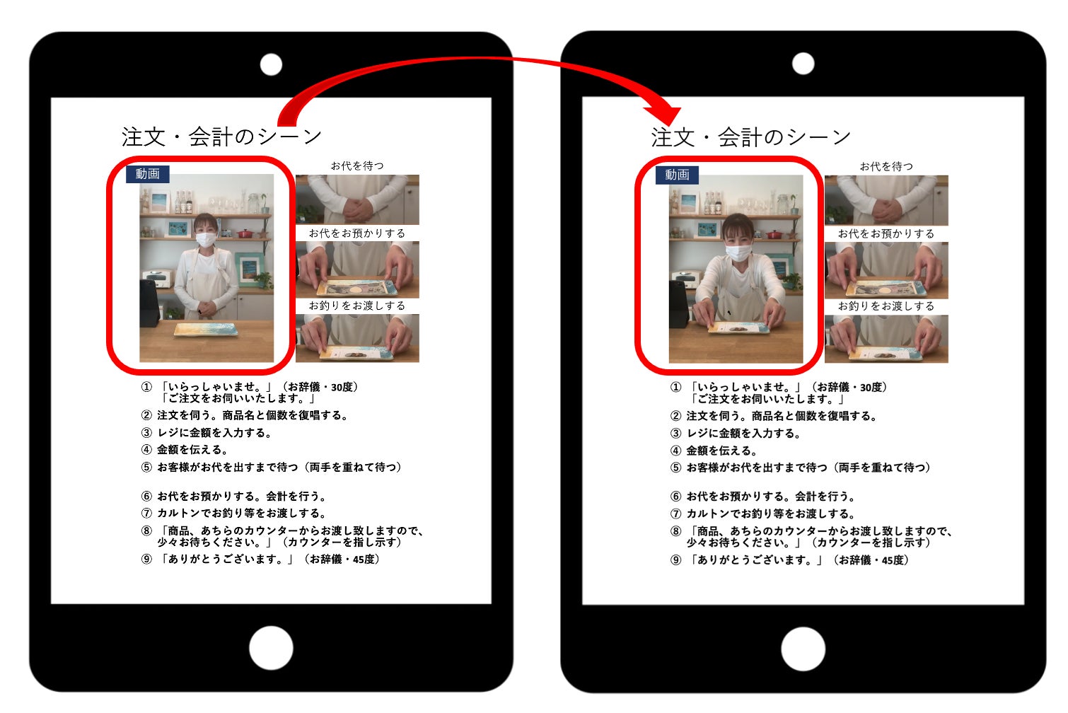当サービスは、このような失敗体験から生まれました。マニュアルにお手本となるサービスの動画を組み込むことで、会社や店舗が目指す接客サービスを可視化します。当時の私のように教える側に教育スキルが不足していても、教わる側は動画のイメージを元に反復学習をすることができる為、効果的にスキルの習得へ繋がります。
