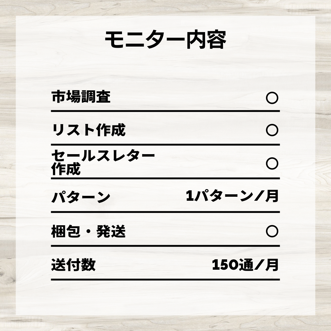 ・サービス詳細:市場調査・リスト作成・セールスレター作成・1パターン/月・梱包、発送